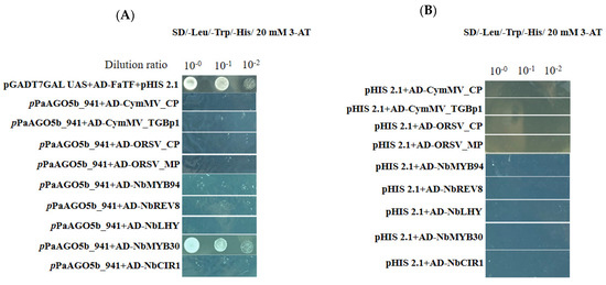 Physical interaction between pPaAGO5b_941 and viral genes or TFs in yeast cells. The full-length clones of CymMV_CP, CymMV_TGBp1, ORSV_CP, ORSV_MP, NbMYB94, NbREV8, NbLHY, NbMYB30, and NbCIR1 and were fused to pGADT74-AD and pPaAGO5b_941 fused to pHIS 2.1-BD were cotransformed and expressed in the yeast strain Y187. The transformed yeast cells were grown in non-selective media with histidine (SD/-Leu/-Trp) (Supplementary Figure S14) or (A) selective media without histidine with 20 mM 3-AT (SD/-Leu/-Trp/-His), followed by incubation at 30 °C for 3 days. The pHIS 2.1 vector and pGADT74-AD cotransformed with strawberry heat shock TF (FaTF) fused with pGBKT7 vector into yeast cells were used as the positive control. (B) The pHIS 2.1 vector and cotransformed with CymMV_CP, CymMV_TGBp1, ORSV_CP, ORSV_MP, NbMYB94, NbREV8, NbLHY, NbMYB30, and NbCIR1 into yeast cells were used as the negative controls.