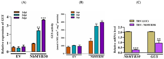 Effects of overexpression and silencing of NbMYB30 on GUS transcript levels in transgenic N. benthamiana plants. (A) The expression level of GUS was analyzed by real-time qRT-PCR, and (B) the activity level of GUS was analyzed by fluorimetric analysis. The transient expression effect of NbMYB30 significantly enhanced the GUS expression and activity level. (C) The TRV-based silencing of NbMYB30 significantly downregulated the transcript level GUS in transgenic N. benthamiana plants. Data are mean ± SD, ** p < 0.01, *** p < 0.001 by Student t-test, respectively.