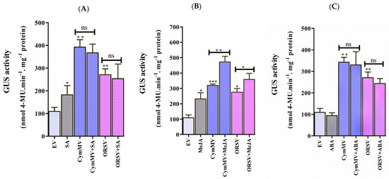 For hormonal treatment, 28-day-old transgenic N. benthamiana plants were sprayed individually with SA (1 mM), MeJA (100 µM), and ABA (100 µM) and infiltrated with CymMV and ORSV infectious clones independently. Another set of plants was infiltrated and sprayed with a combination of viruses and hormones.
