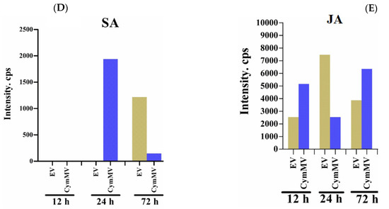 To measure endogenous SA and JA levels, N. benthamiana leaves were vacuum-infiltrated with EV (pKn) and CymMV infectious clones. After infiltration, leaf samples were collected at 12, 24, and 72 h, and SA and JA contents were measured using UHPLC-ESI-MS/MS. The intensity of SA was not detected in EV vector-treated leaves at 12 and 24 h, but it significantly increased at 72 h compared with CymMV-treated leaves. However, at 24 h, the intensity of SA was significantly higher in the CymMV-treated leaves than in the EV leaves (Figure 7D). In addition, the JA intensity was significantly enhanced at 12 and 72 h in CymMV-treated leaves compared with EV-treated leaves. However, at 24 h, JA intensity was significantly decreased in CymMV-treated leaves compared to EV-treated leaves (Figure 7E). We hypothesized that SA and JA act antagonistically during CymMV infection based on this endogenous measurement of SA and JA. Further experiments are needed to analyze the underlying molecular mechanism of action between SA and JA during CymMV infection.