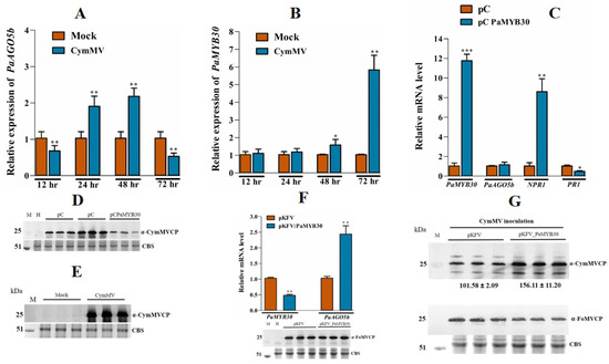 Next, we investigated the causation between PaMYB30 and PaAGO5b expression. We overexpressed FLAG-tagged PaMYB30 and a PVY silencing suppressor, HC-pro, used to improve protein expression in CymMV-inoculated P. aphrodite subsp. formosana leaves. We found that the overexpression of PaMYB30 did not alter the expression level of PaAGO5b (Figure 8C) but unexpectedly resulted in a reduction in CymMV accumulation (Figure 8E). Before analyzing CymMV accumulation during PaMYB30 overexpression, we confirmed CymMV expression in P. aphrodite subsp. formosana leaves (Figure 8D). To verify these results, PaMYB30 was silenced using the VIGS vector pKFV [35]. Real-time qRT-PCR analysis showed that PaMYB30 expression was efficiently silenced by VIGS (Figure 8F); however, PaAGO5b expression was significantly upregulated (Figure 8F). To clarify the role of PaMYB30 in plant defense systems, PaMYB30-silenced and mock-inoculated leaves (agroinfiltrated with empty VIGS vector, pKFV) were inoculated with CymMV. After quantifying viral accumulation, we found that PaMYB30 knockdown contributed to a higher accumulation of CymMV (Figure 8G).