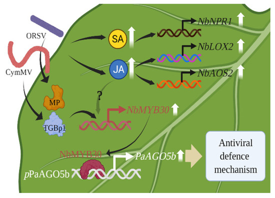 A model for enhancing antiviral defense mechanism through the activation of pPaAGO5b. The CymMV or ORSV infectious clones and their TGBp1, a CymMV-encoded protein, and MP, an ORSV-encoded protein, may upregulate plant defense-related TF NbMYB30. The NbMYB30 TF binds to the pPaAGO5b (p-indicates the promoter) and transcriptionally activates PaAGO5b expression to enhance the antiviral defense mechanism. During virus infection, phytohormones SA and JA and their marker genes were upregulated. Principally, JA was significantly enhanced; however, upregulation of NbMYB30 under JA enhancement during virus infection has not yet been explored. LOX2—lipoxygenase 2; AOS2—allene oxide synthase 2, NPR1—nonexpressor of pathogenesis-related genes-1.