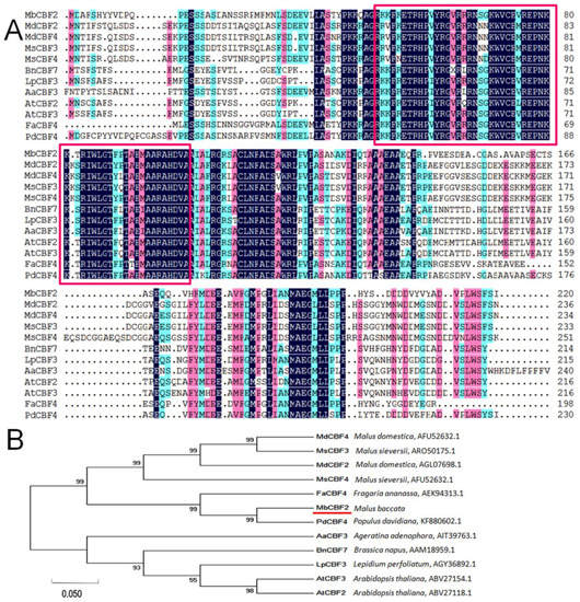 Comparison and phylogenetic relationship between the amino acid sequences of MbCBF2 and the CBF of other species. (A) Through comparison, MbCBF2 was compared with CBF transcription factor proteins of other plants. The red box is the conserved sequence of the gene, and the red underline is the target protein. (B) Analysis of MbCBF2 and CBF transcription factor proteins in different plants by phylogenetic tree. The MEGA-7 adjacency method was used to construct this tree. AtCBF2 (A. thaliana, ABV27118.1), AtCBF3 (A. thaliana, ABV27154.1), AaCBF3 (Ageratina adenophora, AIT39763.1), BnCBF7 (Brassica napus, AAM18959.1), MdCBF4 (Malus domestica, ART85561.1), MdCBF2 (Malus domestica, AGL07698.1), MsCBF3 (Malus sieversii, ARO50175.1), MsCBF4 (Malus sieversii, AFU52632.1), LpCBF3 (Lepidium perfoliatum, AGY36892.1), FaCBF4 (Fragaria ananassa, AEK94313.1), and PdCBF4 (Prunus dulcis, BBN69788.1).
