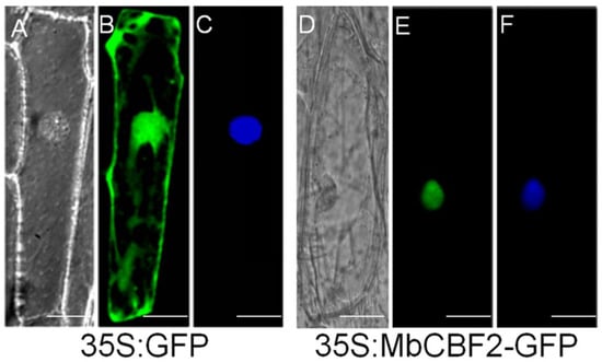 The specific location of MbCBF2 protein was determined by constructing the fusion expression vector of green fluorescent protein (GFP) and the MbCBF2 gene. It can be seen from Figure 2 that the MbCBF2-GFP fusion protein can only be detected in the nucleus (Figure 2E), while the GFP—as the control—can be observed in the whole cytoplasm (Figure 2B). At the same time, the location of the nucleus was confirmed by 4′, DAPI staining (Figure 2F). Therefore, it can be concluded that MbCBF2 is a nucleus-located protein.