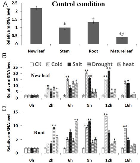 Q-PCR results of the MbCBF2 gene. (A) Expression of MbCBF2 in new leaves, stems, roots and mature leaves of the normal-growing Malus baccata. Expression of the MbCBF2 gene in (B) new leaves and (C) roots under the control (CK) and four stress conditions. Each datum in the figure is taken as the average value obtained by repeating three times. Compared with the control group, the asterisks above the column indicate significant differences and extremely significant differences (*, p ≤ 0.05; **, p ≤ 0.01).