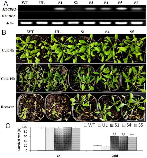 The cold tolerance of A. thaliana was improved due to the overexpression of MbCBF2. (A) The expression levels of MbCBF2 in WT, UL and T2 transgenic of transgenic A. thaliana were observed by semi-quantitative RT-PCR with MbCBF2-specific primer (MbCBF2+) and non-specific primer (MbCBF2−). The control was actin. (B) Phenotypes of the MbCBF2 transgenic A. thaliana lines (S1, S4, S5), WT and UL under low-temperature stress and recovery. (C) A t-test showed that there were significant differences in the survival rates between transgenic A. thaliana (S1, S4 and S5) and WT lines under low-temperature conditions (**, p ≤ 0.01). The scale bar corresponds to 3 cm.
