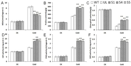 It can be seen from Figure 4B that under the control conditions (low-temperature for 0 h), the phenotypes of all of the A. thaliana strains (WT, UL, S1, S4 and S5) were basically the same. However, after 10 h of treatment at −4 °C, the WT, UL, and transgenic (S1, S4 and S5) lines were injured to varying degrees, among which UL and WT had more obvious leaf wilt, and the leaves were seriously damaged. Compared with UL and WT, although some of the leaves of transgenic plants were injured, the overall wilting situation was not particularly obvious.