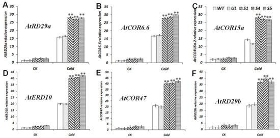 Expression levels of six cold stress-related genes in WT, UL, and transgenic A. thaliana under low temperatures. (A) Relative expression level of AtRD29a, (B) relative expression level of AtCOR6.6, (C) relative expression level of AtCOR15a, (D) relative expression level of AtERD10, (E) relative expression level of AtCOR47, (F) relative expression level of AtRD29b. The data are the average of three repetitions. Asterisks above the columns indicate significant differences compared to the WT under cold stress (**, p ≤ 0.01).