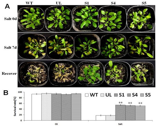In order to explore the role of MbCBF2 when the plants are in a high-salt environment, WT, UL and transgenic A. thaliana strains (S1, S4 and S5) were transplanted into plastic square pots with a substrate (nutrient soil and vermiculite: 1:1); then, the square pots were placed into a tray, and the plants were irrigated with 200 mM NaCl through the holes at the bottom of the pot. After 7 d, the phenotype of each strain was observed (Figure 7A). Under the salt stress treatment, the leaves of the WT, UL and transgenic plants were all yellowed. Compared with the transgenic plants, the UL and WT leaves’ yellowing was more serious. The survival rate of each A. thaliana was counted after 3 days of recovery, as shown in Figure 7B. Under the control conditions, all of the A. thaliana strains (WT, UL, S1, S4 and S5) have basically the same survival rate. However, under salt stress, the survival rates of the transgenic plants were 54.87%, 52.78% and 51.99%, respectively, while UL was 17.98% and WT was 18.04%. It is obvious that transgenic A. thaliana has a higher survival rate than UL and WT in a high-salt environment.