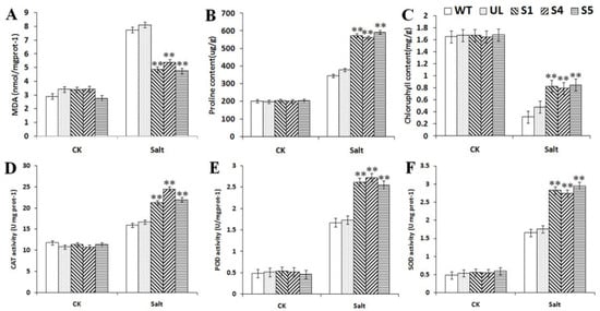The selected WT, UL and transgenic lines (S1, S4, S5) were sown in the medium, respectively, until the A. thaliana seedlings grew four leaves; they were then moved to a nutrition bowl and marked. The UL, WT and transgenic plants were divided into three groups: one group was cultured normally at 23 °C, while the other two groups were placed under −4 °C for cold treatment, and were treated with 200 mM NaCl, respectively. After continuous watering for 7 days, we observed the phenotype of A. thaliana. Each A. thaliana leaf was sampled, and the content of chlorophyll, proline and MDA, and the activities of SOD, POD and CAT were measured [,,,]. The treated A. thaliana were placed in a lighted incubator for normal watering in order to recover; we then observed the phenotype of each A. thaliana, and ascertained its survival rate.