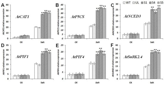 Expression levels of drought stress-related genes in WT, UL, and transgenic A. thaliana. under salt stress. (A) Relative expression level of AtCAT1, (B) relative expression level of AtP5CS, (C) relative expression level of AtNCED3, (D) relative expression level of AtPIF1, (E) relative expression level of AtPIF4, and (F) relative expression level of AtSnRK2.4. The data are the average of three repetitions. Asterisks above the columns indicate that there is a significant difference between transgenic and WT A. Thaliana under salt stress (**, p ≤ 0.01).