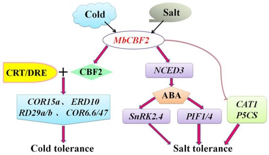 To sum up, combined with previous studies and the above results, a potential model was derived to describe the mode of action of MbCBF2 under salt and cold stress (Figure 10). First, salt stress induced the expression of MbCBF2, thereby evidently in creasing the expression level of AtNCED3, promoting ABA biosynthesis and signal transduction, causing a significant up-regulation of AtSnRK2.4 expression and enhancing the adaptability of transgenic plants to salt stress. In addition, the expression levels of the key genes AtCAT1, AtP5CS, AtPIF1 and AtPIF4 in response to salt stress were also significantly increased when plants were stressed, indicating that key genes under salt stress could be regulated by MbCBF2, thereby enhancing the salt tolerance of transgenic plants. When a cold shock signal is felt, MbCBF2 is induced by cold stress, and its encoded product specifically binds to the CRT/DRE cis-elements on the promoters of multiple anti-stress genes, causing the high expression of downstream cold-regulated genes (AtCOR15a, AtRD29a, AtCOR6, AtERD10, AtCOR47 and AtRD29b), thereby enhancing the cold tolerance of plants.