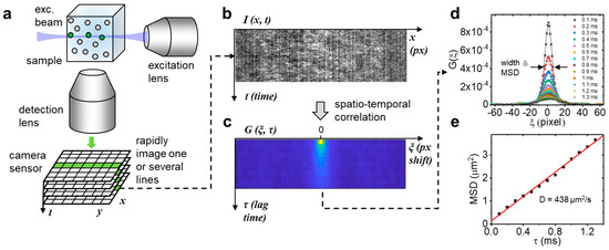 Line illumination principle. (a) A thin beam of light is injected into the sample from the side and fluorescence is collected perpendicular to the beam direction with a high numerical aperture lens. A rapid time series of the resulting signal is collected with a fast camera. (b,c). One or multiple lines are extracted from this data set followed by spatiotemporal correlation of the space-time series. (d,e) The correlation function for each lag time is fitted with a Gaussian distribution. The width of this distribution corresponds to the mean square displacement of the molecules under study and plotted as a function of the lag time, the absolute diffusion coefficient can be determined from the slope.