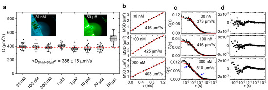 By illuminating with a Gaussian beam (Figure 1a), only one or a few lines of the camera chip are relevant to capturing the fluorescence from this thin, tubular observation volume and, in such region of interest, the camera frame rate could be increased to >10,000 Hz (<100 µs pixel dwell time). Each pixel in each line of this space-time (x, t) data set (Figure 1b) was then correlated with all other pixels in the same line to generate a correlation carpet of space and time lag (ξ, τ) (Figure 1c), to which a Gaussian function was fitted for each line (Figure 1d). By plotting the width of those Gaussians as a function of time lag (Figure 1e), the mean square displacement of the molecules was obtained, similar to the image mean square displacement (iMSD) analysis principle [11,12]. Notably, the only two parameters needed to quantify these data are the pixel size at the sample given by the objective effective magnification and the lag time between frames given by the camera frame rate. Contrary to single point FCS, no calibration of the observation volume size is needed to obtain the absolute value of the diffusion coefficient. We first validated our approach by measuring the (known) diffusion coefficient of a small dye in aqueous solution. For this purpose, Atto 488 was chosen because of its high water solubility, good photophysical parameters (QY = 0.8, ε = 90,000 in PBS at pH 7.4), and widespread use in fluorescence sensing applications. Like many small dyes of similar molecular weight (~0.8 kDa), Atto 488 diffuses at ~400 µm2/s in aqueous solution at room temperature [13], demanding a very high temporal resolution. The dye was diluted in PBS buffer at different concentrations in a range of 30 nM to 50 µM. Ten sets of 10,000 frames (1 s acquisition time for each set) were taken per concentration. The measured diffusion coefficients are shown in Figure 2a. The insets show photographs of the sample chamber filled with Atto488 solution was excited with 488-nm light. At a 30 nM dye concentration, the excitation beam/light sheet can be seen as faint green fluorescence trace within the solution. The cyan background visible in the photograph is a result of scattered 488-nm excitation light. At 50 µM of dye concentration, a >1000-fold increase, all excitation light is completely absorbed, and the resulting green fluorescence is much stronger. Figure 2b shows three example concentrations measured with the LIM method and corresponding single point FCS data fitted with a free diffusion model. Residuals are shown in Figure 2c,d. While the low correlation amplitude of single point FCS at a concentration >100 nM resulted in overestimated diffusion coefficients (510 ± 25 µm2/s at 300 nM), the MSD diffusion coefficient remained at the expected value up to 30 µM, a more than 100-fold increase of the measurement range. At higher dye concentrations, the signal-to-noise ratio of the measured correlation functions significantly declined, resulting in an overestimation of the diffusion coefficient at 50 µM (Figure 2a). We note that, at 50 µM, absorption of the excitation light by the highly concentrated dye (filter effect) prohibited the correct formation of the illumination beam at the focal plane of the detection lens. This effect is shown in the right inset of Figure 2a, where the excitation beam coming from the top right generated the strongest fluorescence immediately after entering the sample chamber and quickly declined towards the middle of the sample, where the signal was measured. In contrast, the fluorescence generated at 30 nM (left inset), was uniform across the entire illumination path. Thus, with an optimized sample geometry that reduces the relatively long path of the excitation beam through the sample solution before reaching the observation area, it may be possible to further increase the concentration range.