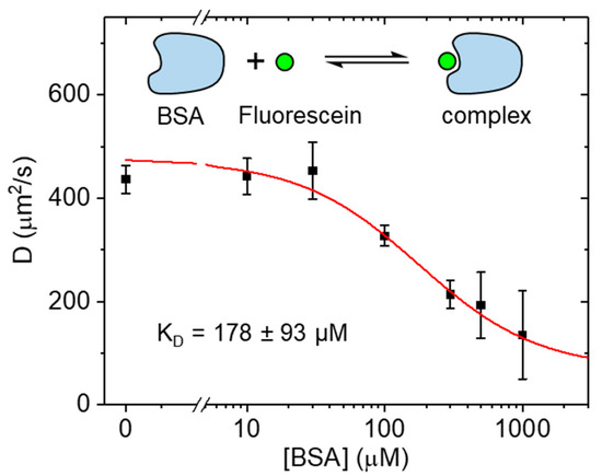 Diffusion coefficients of fluorescein mixed with BSA at different concentrations. When bound to BSA, the diffusion coefficient was much reduced compared to free fluorescein. With 4 µM of fluorescein, a KD of 178 ± 93 µM BSA was obtained (mean ± SD).
