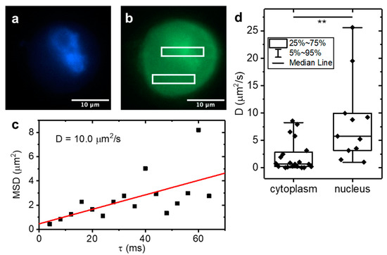 Finally, we applied LIM to MCF10A cells over-expressing Arc-EGFP. Arc (Activity-regulated cytoskeleton-associated protein) or Arg 3.1 (Activity-regulated gene 3.1) is a key regulator of synaptic plasticity and required for long-term memory formation. In addition to a cytoplasmic fraction, Arc also accumulates in the nucleus where it is known to function as a transcriptional regulator. Using raster image correlation spectroscopy (RICS), we recently found that nuclear Arc displayed higher diffusivity than cytoplasmic Arc. As single point FCS, RICS is limited to nanomolar concentrations unless combined with super-resolution methods [17]. To validate application of the LIM method to live cells, we imaged MCF10A cells expressing Arc-EGFP in various locations within the cell. The cell nucleus was co-stained with NucBlue (Figure 4a) to be able to differentiate between nuclear and cytoplasmic Arc-EGFP (Figure 4b, boxes); an example LIM plot is shown in Figure 4c. We found an average diffusion coefficient of 3.0 µm2/s for the cytoplasm compared to significantly faster diffusion at an average of 8.8 µm2/s in the nucleus (Figure 4d), confirming the trend that we had previously obtained by means of RICS [18]. In addition to determining the particle dynamics, correlation methods can also measure the average concentration by means of the correlation function amplitude and the size of the observation volume. However, as with RICS, subtraction of the immobile fraction modifies the correlation function amplitude and absolute concentrations can no longer be measured accurately. However, relative concentrations can still be determined, and we found that, in the nucleus, the average Arc-EGFP concentration was ~6-fold higher than in the cell cytoplasm. Notably, our LIM measurements were carried out in cells 3D cultured in a collagen matrix as opposed to conventionally 2D plated cells that were used for the RICS experiments.