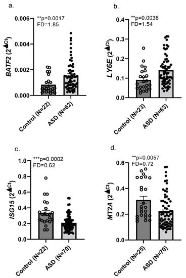 Whole blood samples were collected from 73 children with ASD and 26 NT children at Shaare Zedek Medical Center (Jerusalem, Israel) and Phoenix Children’s Hospital (Phoenix, AZ, USA). The demographics of the Israeli and U.S. cohorts are presented in Table 1. RNA was extracted from these blood samples as described in Methods. RNA from eight males with ASD (mean age 13.5 ± 2.6 y) and nine NT males (controls; mean age 15.4 ± 1.9 y) were used for RNA-seq analyses as described in the Methods. Bioinformatic analysis of the RNA-seq reads, followed by p-value adjustment for genome-wide transcriptomics, identified 10 dysregulated genes with differential expression in whole blood in the ASD compared to the control group, with padj < 0.05 (Table 2). Next, we performed real-time qPCR validation for these dysregulated genes in both the Israeli and American cohorts of whole blood samples from ASD and matched NT children; Table 1). Our real-time qPCR findings showed that four of the genes detected as dysregulated by RNA-seq were dysregulated in the combined Israeli and American cohorts of whole blood RNA samples (Figure 1). We observed upregulated expression of BATF2 and LY6E (FD = 1.85, p = 0.0017; FD = 1.54, p = 0.0036) and downregulated expression of ISG15 and MT2A (FD = 0.62, p = 0.0002; FD = 0.72, p = 0.0057) in the ASD compared to the NT control children. Other genes found as dysregulated in RNA-seq analysis of our discovery cohort blood samples (Table 2) were not confirmed in the combined cohorts. Real-time qPCR findings from the Israeli cohort alone agreed with our findings of upregulated BATF2 and downregulated ISG15 and MT2A in the combined Israeli and American children with ASD compared with NT children and, in addition, showed upregulated FCGR1A in the Israeli children with ASD (Supplementary Figure S1).
