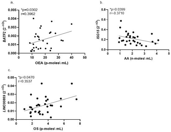 Correlations for whole blood mRNA expression levels with serum endocannabinoid levels in ASD children (Israeli cohort). Correlations are shown for (a) BATF2 and oleoylethanolamide (OEA); (b) ISG15 and arachidonic acid (AA); (c) LINC00869 and Oleoyl serine (OS). The r and p values for each correlation plot (Spearman test) are shown in each panel. Endocannabinoid levels are from Aran et al., 2019 [18]. * p < 0.05. See Section 4 for further details.