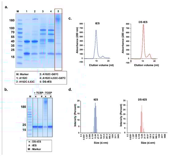 (a) Sequential engineering of DS-tES. Non-reducing SDS-PAGE of the selected mutants. (b) SDS-PAGE analysis of DS-tES and tES in the absence or presence of TCEP. (c) Size-exclusion chromatography of tES and DS-tES with similar elution profiles. (d) Hydrodynamic diameter measurements of tES and DS-tES using dynamic light scattering studies.