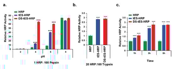 DS-tES-HRP/tES-HRP/HRP were incubated for 2 h in different concentrations of trypsin (0.25 and 0.4%). The HRP activity was measured similarly to as described in the pepsin assay.