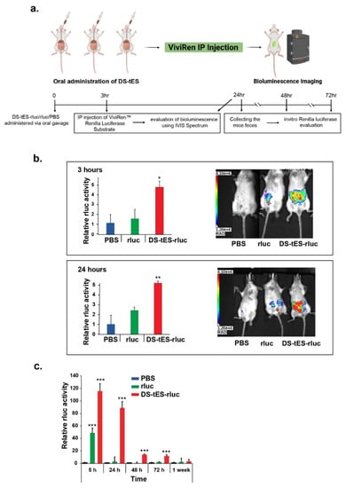 (a) Schematic representation of oral administration of DS-tES-rluc/rluc followed by IP injection of ViviRen substrate. (b) Bioluminescence emitted from mice administered with DS-tES-rluc/rluc in 3 and 24 h. (c) Luciferase activity measurement from mice fecal matter for up to 1 week. ((b,c): data are shown as mean ± SEM, n = 4. *** p < 0.001, ** p < 0.01, * p < 0.05).