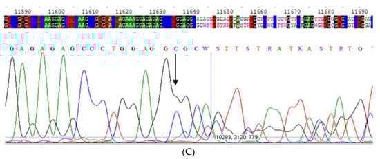 (A) Electropherogram of Mwurzuburg variant in homozygosis; (B) Electropherogram of Mwurzuburg variant in heterozygosis; (C) Electropherogram of Mwhitstable variant in heterozygosis.