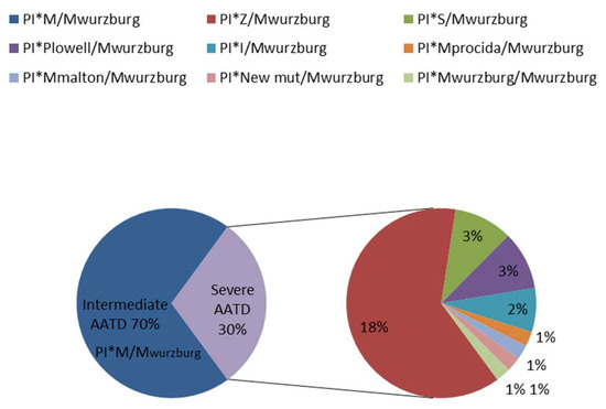 Mwurzburg is an AAT pathogenic variant with a tendency to form polymers. Polymerization is the consequence of a transport block between the ER and Golgi complex and it is usually associated with neonatal hepatitis, cirrhosis, and hepatocellular carcinoma. The intracellular polymerization of the Mwurzburg protein has been demonstrated in cell models [15,16]. The clinical impact of this variant is not yet clear, since clinical case reports of AATD with the Mwurzburg variant are infrequent and controversial [8,17,18]. Nevertheless, in our experience, its presence is rare but not negligible. Accordingly, the allele frequency of Mwurzburg in all subjects analyzed in our lab over the last 16 years (for a total of 10,660 samples) is 0.006 (Figure 3).