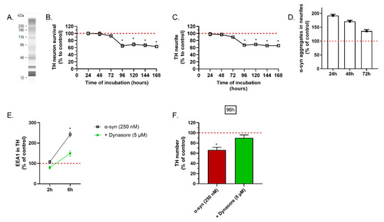 Effects of the different timing of α-syn incubation and dynasore on TH-expressing neurons and endocytosis. (A) WES analysis of α-syn preparation: virtual blot of the preparation composition. (B) Total number of TH(+) neurons (control = 23 ± 5), (C) length of TH(+) neurite network (control = 1261 µm ± 7), (D) area of cytoplasmic α-syn in TH neurons (control = 24 µm2 ± 5) in TH neurons after treatment with α-syn were studied after different incubation durations. (E) Expression of EEA1 marker in TH neurons (control = 204 µm2 ± 6) were studied 2 h and 6 h after application of dynasore and (F) survival of TH(+) neurons 96 h after (control = 114 ± 6). All values were expressed as mean ± SEM; *, p < 0.05 with One-way ANOVA followed by Fishers’ test.