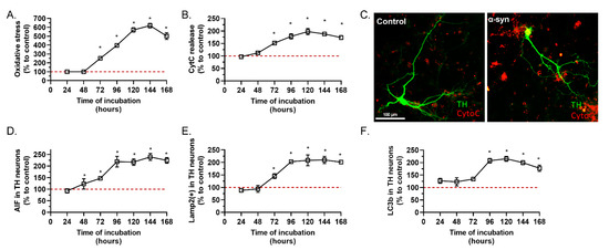Lysosomal pathway dysfunctions are characteristic of Parkinson’s disease. α-syn is degraded by the autophagy-lysosomal pathway and interacts with lysosomal proteins [27]. The application of α-syn in our primary culture induced a clear accumulation of lysosomes, after 72 h (Figure 2E,F). Interestingly, the accumulation of lysosomes parallels oxidative stress suggesting a temporal link between lysosomal and mitochondrial stress. We have also noted a significant accumulation of LC3(+) autophagosomes in the cytoplasm of TH(+) neurons, at 96 h after α-syn application (Figure 2F).