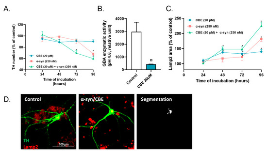 Progressive loss of TH(+) neurons after application of α-syn or α-syn + CBE. (A) Number of TH(+) neurons (control = 23 ± 5) after different incubation times with CBE and α-syn, (B) enzymatic GBA activity following CBE intoxication and (C) lysosomal impairments (control = 46 ± 3) after different incubation times. (D) Representative pictures of Lamp2 staining (red) in TH neurons (green) and the computer-assisted segmentation resulting from data processing (white): control condition (left panel), α-syn condition (middle panel) and segmentation (right panel). All values are expressed as mean ± SEM; *, p < 0.05 with One-way ANOVA followed by Fisher’s LSD test; or ¤ p < 0.05 with Mann-Whitney test.