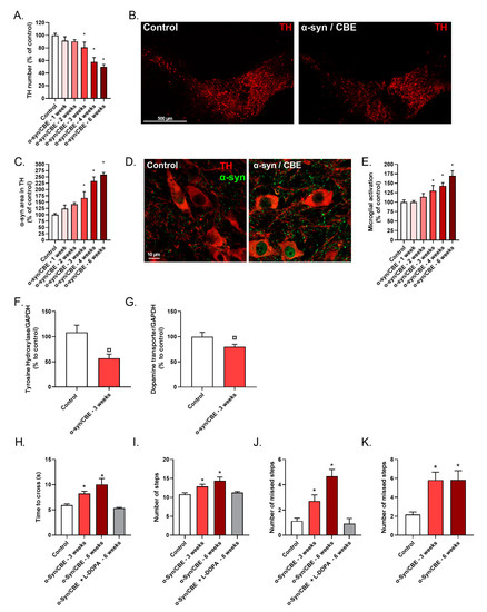 These histological observations were well correlated with the motor dysfunctions of the animals. In the bar test, we found, on week 3 after the surgery, that the α-syn/CBE mice crossed the bar more slowly as compared to the control mice (Figure 4H). α-syn/CBE mice also needed more steps to reach the platform (Figure 4I) and presented a higher number of slips compared to control mice (Figure 4J). These motor dysfunctions were still observed 6 weeks after surgery, but were not exacerbated. Interestingly, after an acute administration of L-Dopa, a DA precursor used as reference treatment in Parkinson’s disease, motor impairments were attenuated. Indeed, mice managed to cross the bar as quickly as the control mice (Figure 4H). Moreover, the number of steps and slips were also lower after L-Dopa injection, back to the control mice level (Figure 4I,J).