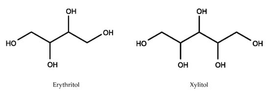 The still-steady rise in sugar consumption is a key contributor to the dramatic global rise in obesity and associated metabolic disorders, especially type 2 diabetes mellitus. The WHO has proposed a reduction in sugar intake as a preventive and therapeutic strategy to curb these disorders []. A possible solution to achieve a reduction in sugar intake is the partial substitution of table sugar and added sugars with low-caloric, naturally occurring bulk sweeteners, also called polyols. Polyols are mono- and polysaccharides in which a carbonyl group is replaced by an alcohol (hydroxyl) group. Polysaccharide polyols are difficult to digest and metabolize due to their hydroxyl groups and their glycosidic linkages other than α1-4 and α1-6 []. Monosaccharide polyols, such as erythritol and xylitol, are partly absorbed by passive diffusion along a concentration gradient in the small intestine []. These monosaccharide polyols are gaining popularity among patients with overweight and diabetes thanks to their low glycemic indexes [], which gives them anti-hyperglycemic and anti-diabetic properties []. In addition, erythritol and xylitol induce the secretion of gastrointestinal satiation hormones (such as cholecystokinin (CCK) and glucagon-like peptide-1 (GLP-1)) and promote satiety and slow gastric emptying [,,]. Furthermore, the two polyols actively benefit oral health [].