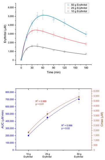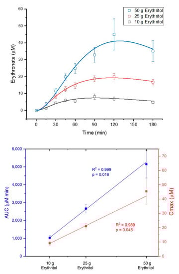 Figure 2 shows the concentration-time curves and the dose-response diagram for AUC180 (dose-response: R2 = 0.996, p = 0.02) and Cmax (dose-response: R2 = 0.999, p = 0.01) of erythritol after administration of the three loads.