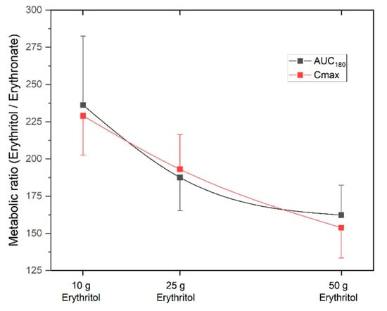 The metabolic ratio AUCerythritol/AUCerythronate was highest with the 10 g erythritol load and decreased with higher doses (ratio AUC180 for 10 g: 236.2 ± 46.3 vs. 25 g: 187.6 ± 22.4 vs. 50 g: 162.3 ± 20.1, differences not significant). The Cmax, erythritol/Cmax, erythronate ratio was also highest with the 10 g erythritol load compared to the higher doses (ratio Cmax for 10 g: 229.0 ± 26.5 vs. 25 g: 193.1 ± 23.3 vs. 50 g: 153.8 ± 20.4, differences not significant). These decreasing metabolic ratios with higher doses of erythritol indicate that an increasing fraction of erythritol is metabolized into erythronate. Figure 4 shows the metabolic ratios depending on the different doses of erythritol. This phenomenon is also reflected by the non-linear dose-response for AUC180 and Cmax, as shown in the lower part of Figure 2.