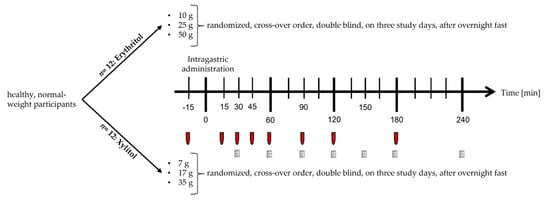 This acute study was conducted as a parallel trial. The first twelve included participants were given erythritol; the following twelve participants were included in the xylitol arm. Within the arms, the doses were given in a randomized order. The trial was conducted double blind, meaning that the study participant, the person carrying out all tests, and the personnel performing the analyses of blood samples were blinded concerning the dosage assigned to the participant. Some participants (n = 7) participated in the xylitol arm after enrolling in the erythritol arm. That is why the total number of participants was only 17. For participants included in both arms, a wash-out phase of at least four days between the two interventions was respected.