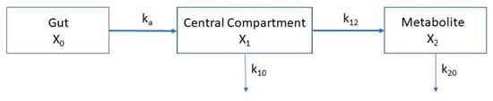 This linear three-compartment model describes the mass transfer between the first compartment (X0, gut), from which the absorbable fraction of the erythritol/xylitol dose (F × dose, where F = bioavailability) is absorbed into the central compartment (X1, blood) by a linear process with a rate constant ka. Erythritol/xylitol in compartment X1 is either eliminated from the compartment (elimination rate constant k10) or metabolized into erythronate in the compartment X2. Although the formation of erythronate from erythritol/xylitol is done by enzymatic reaction, it could best be modeled by a linear process and was denoted by the formation rate constant k12. The elimination of erythronate from the metabolite compartment (X2, blood) is described by the elimination rate constant k20. The volumes of distribution of compartments X1 and X2, called V1 and V2, respectively, relate the masses to plasma concentration (y1 and y2), as shown in the following Equation (2):