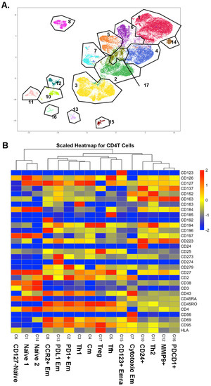 CD4+ T cells were identified as CD19−, CD3+, CD4+, and CD8− cells. CD4+ T cells underwent Louvain clustering. Gates were overlaid to show cluster borders in feature maps (Figure 1A). Initially, 17 clusters were identified in CD4+ T cells, but cluster 9 was identified as likely doublets between CD4+ T cells and myeloid cells, considering some myeloid cell markers such as CD33 positivity. Among the other 16 CD4+ T cell clusters, we identified three naïve clusters, one Thone, one Th2, one Tfh, and one Treg cluster, based on the heatmap of the informative surface markers (Figure 1B). Other clusters were identified as central memory (Cm, CD45RA-CD197+) and effector memory (Em, defined as CD45RA-CD197-; cluster 2: PD1+; cluster 7: cytotoxic, CD56+; cluster 8: CCR2+; cluster 13: PDL1+). Cluster 15 was identified as terminally differentiated effector memory (Emra; CD45RA+ CD197-). Cluster 12 was MMP9+ and cluster 16 was PDCD1+ based on mRNA expression. Violin plots for the expression of all surface markers in each cluster are shown in Figure S2.