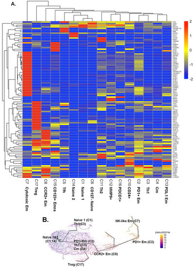 Monocle Version v3.10 (http://cole-trapnell-lab.github.io/monocle3/, accessed on 16 November, 2021) was used for trajectory inference in the CD4+ T cell population. Data were first normalized, and the first 20 principal components were computed based on the default PCA method. The cells were projected into a low-dimensional space with the help of Monocle 3’s inbuilt UMAP dimensionality reduction function. Cells were then clustered with the help of the Louvain method with default clustering parameters. Monocle 3 uses a principal graph embedding algorithm to learn cell trajectories in a low-dimensional space. To construct trajectories, the root node was anchored at naïve CD4+ T cells (clusters 1 and 14) and the pseudo-time was estimated.