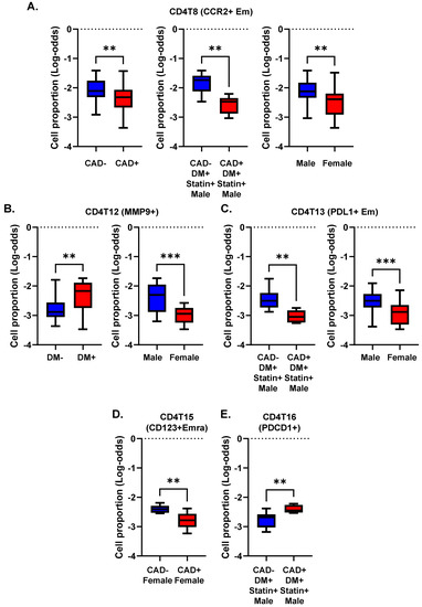 We asked whether, and if so, how, DM, CAD, and sex correlated with the abundance (cell number) of CD4+ T cell subsets expressed as log odds ratios (cell counts are in Supplemental Excel File S3). We compared the log-odds ratios for each of the CD4+ T cell clusters (Figure 3). The proportion of CCR2+ effector memory CD4+ T cells (cluster 8) was significantly (p < 0.01) lower in subjects with CAD than in those without CAD. This was mainly driven by a strong decrease in diabetic men with statin treatment (Figure 3A). CCR2 has been reported to be involved in Treg cell recruitment [20], but this role has not been shown in atherosclerosis. Women showed a significantly lower proportion of cluster 8 than men (Figure 3A).