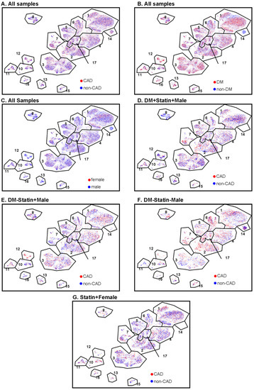 CAD, DM, and sex features projected onto CD4+ T cell UMAPs. (A) CAD (red) and non-CAD (blue) projected to UMAPs from all the samples. (B) DM (red) and non-DM (blue) projected to UMAP from all the samples. (C) Female (red) and male (blue) projected to UMAP from all the samples. (D–G) CAD (red) and non-CAD (blue) projected to UMAP from DM + statin + male samples (D), DM-statin + male samples (E), DM-statin-male (F), and all statin + females (G). Gates (black polygons) and cluster numbers from Figure 1.