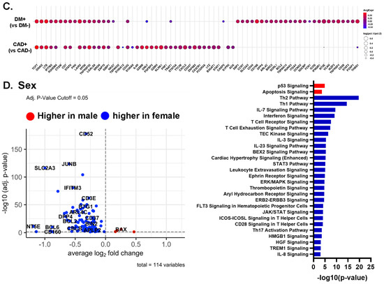 (A,B) Volcano plots comparing gene expression in single cells and Ingenuity Pathway analysis (−log10 p-value > 3) of CAD high vs. CAD low (A) and of DM+ vs. DM− (B) in all CD4+ T cells. Red bar means positive Z-score, and blue bar means negative Z-score. (C) Dot plots of differentially expressed genes between CAD+ vs. CAD−, and between DM+ vs. DM− in all CD4+ T cells. The thresholds set for the plots were adjusted p-value < 0.05, avg.Log2FC > 0 or <0, and pct.1 > 0.2. The size of dots represents log(pct.1/pct.2), where pct.1 is the proportion of cells expressing each gene in DM or CAD+ and pct.2 is the proportion of cells expressing each gene in DM− or CAD−. (D) Volcano plots comparing gene expression in single cells and Ingenuity Pathway analysis (−log10 p-value > 3) for gene expression in CD4+ T cells from male and female subjects. Red bar means positive Z-score, blue bar means negative Z-score.