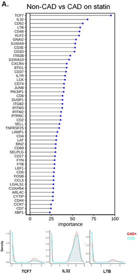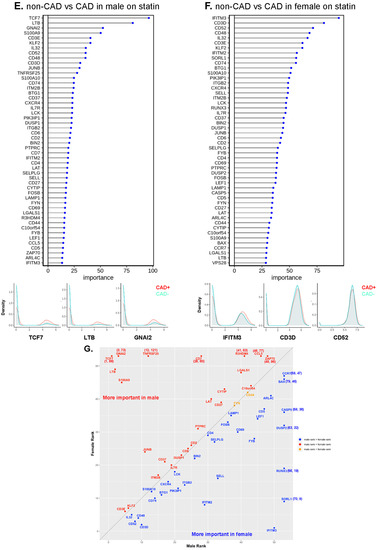 It is well known that coronary artery disease and its complications including myocardial infarction manifest differently in men and women [34]. Plaque instability in women is more commonly attributed to erosion, whereas rupture is more common in men [35]. However, much less is known about sex differences in immune cells between CAD cases and controls. Here, we show a surprising male-to-female difference in upregulated genes in blood CD4+ T cells. There is a group of genes that are equally important in males and females (ranked in the top 10): KLF2, CD3D, CD3E, IL32, CD48, and CD52. The importance of CD3D and CD3E suggests that the signaling strength of the TCR is increased in males and females with CAD. IL32 is a known atherosclerosis-associated gene [25,36]. KLF2 is involved in Treg development [37], but the function of KLF2 in CD4+ T cells in the development of CAD is unknown. CD48 on T cells enhances TCR signaling through cis interactions with CD2, LAT, and Lck [38,39] and is related to CD4+ T cell activation in other diseases [40,41]. Human and mouse antigen-activated T cells with high expression of CD52 suppressed other T cells [42]. In DM-prone mice, transfer of lymphocyte populations depleted of CD52hi cells resulted in a substantially accelerated onset of DM [42]. Some genes that are important in predicting CAD in females are in the interferon pathway (IFITM2, IFITM3). Genes that are important in men but not women are TCF7 (a transcription factor mainly expressed in naïve T cells), GNAI2, and lymphotoxin B (LTB).