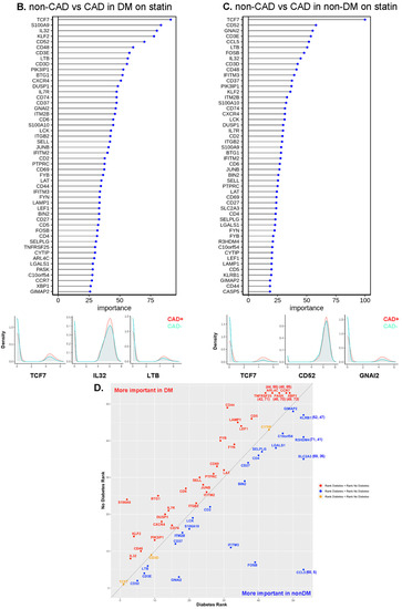 To identify the genes with the highest capability to distinguish between disease groups, we used the random forest machine learning (ML) approach. To decrease the covariates, we focused on the participants treated with statins, constituting the majority of our subjects. TCF7 was the most important gene to separate CAD from non-CAD participants (Figure 6A), regardless of DM status (Figure 6B,C). The bottom panels of Figure 6A–C show overlaid ridge plots for the expression of key genes. In DM, TCF7, S100A9, IL32, and KLF2 were overexpressed in CD4+ T cells from subjects with CAD (Figure 6B). In non-DM subjects, TCF7, CD52, and GNAI2 were overexpressed in CAD (Figure 6C). We correlated the gene ranks in DM and non-DM (Figure 6D), which showed that S100A9 was more important in DM, and IFITM3, FOSB, and CCL5 were more important in non-DM.