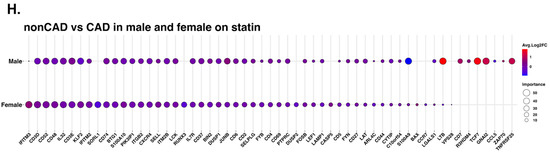 Next, we investigated the driver genes for CAD in males and females separately (Figure 6E,F). Interestingly, TCF7 was important in males, but not in female participants with CAD. IFITM3 was the most important gene to separate CAD from low-CAD in women, but was ranked 50th in males. This gene encodes interferon-induced transmembrane protein 3. The discrepancies in gene expression in CD4+ T cells between women and men with and without CAD are striking and unexpected. CD4+ T cells from CAD+ men significantly overexpressed TCF7, LTB, and GNAI2 (Figure 6E, lower panels), whereas the top genes in women were IFITM3, CD3D, and CD52 (Figure 6F, lower panels). We correlated the gene ranks in males and females (Figure 6G), which showed that TCF7, LTB, and GNAI2 were more important in males, and IFITM2, IFITM3, and SORL1 were more important in females. For the genes ranked in the top 50 in both men and women, we also constructed a dot plot of expression (Figure 6H).