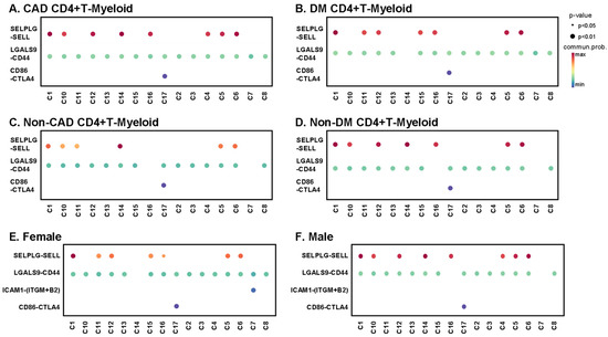 CD4+ T cells interact with myeloid cells in the context of antigen presentation [30], co-stimulation, co-inhibition, and for inflammatory receptor–ligand interactions of cytokines and chemokines. We identified classical, nonclassical, and intermediate monocytes as well as dendritic cells. T cell-myeloid interactions are known to be important for antigen presentation. Here, we focus on predicted interactions with p < 0.01, with the communication probability coded by color from low (blue) to high (red). All CD4+ T cell clusters from subjects with CAD showed interactions between LGALS9 and CD44 (Figure 7A), and all except cluster 14 showed this interaction in DM+ subjects (Figure 7B). Galectin-9 (coded by LGALS9 gene) is a crucial regulator of T cell immunity by inducing apoptosis in specific T cell subpopulations associated with autoimmunity and inflammatory disease [31]. About half of the CD4+ T cell clusters showed L-selectin (SELL) interaction with PSGL-1 (SELPLG) in both CAD+ and DM+ subjects (Figure 7A,B). Multiple studies have provided evidence supporting key roles of SELP and SELPLG in atherosclerotic lesion formation, thrombosis, and arterial wall changes [32,33]. The SELL-SELPLG interaction was stronger in males than in females (Figure 7E,F). There was no male–female difference in LGALS9–CD44 interaction. Uniquely, only Tregs (cluster 17) showed CTLA4 interaction with CD86 in both males and females. In non-CAD and non-DM subjects (Figure 7C,D and Figure S5), the interaction pattern of CD4+ T cells with myeloid cells was similar, but significant interactions were fewer. The CTLA4 interaction with CD86 in Tregs was preserved.