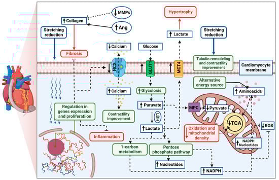 Cardiac metabolism plays a central role in the pathophysiology of HF []. Its alterations profoundly impair cardiac function and develop further progression. Metabolic modulators are recently thought to display therapeutic potential in cardiovascular diseases [,]. The reduction in fatty acid (FA) oxidation is one of the starting points. In normoxia, FA breakdown is the main source of ATP (about 70%), alongside glucose and lactate []. It should be noted that energy production from glucose requires less oxygen than FA, which is crucial in ischemia conditions []. Therefore, decreased FA metabolism has been reported in many animal models, also related to left ventricle dysfunction, and it is mainly observed not in an early but advanced stage of HF [,,]. It might be caused by the lower energy demand and optimized ATP production or, as previously mentioned, directing glucose into alternative and more beneficial pathways (Figure 1). Thus, the new therapeutic approach for LVAD patients might be the regulation of FA oxidation in favour of glycolysis to generate biomolecules promoting the normal energy state of cardiomyocytes [].