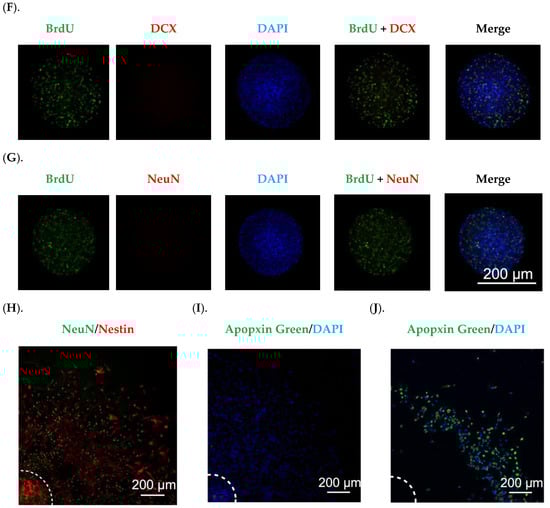 To characterize the proliferation of the formed neurospheres in Figure 1D, BrdU was added to the culture medium at a final concentration of 10 µM and the incubation was continued for 3 h. The neurospheres were gently aspirated, washed twice with PBS, and fixed in 4% PFA in PBS for 10 min at room temperature, followed by 2× PBS washes. Neurospheres were then incubated in 2 N HCl for 30 min under 37 °C to hydrolyze the DNA. The mixture was neutralized in 0.1 M sodium borate buffer (pH 8.5) for 30 min at room temperature. After two washes with PBS, samples were blocked and permeabilized in PBST containing 5% normal goat serum and 0.3% TritonX-100. The preparation was further incubated with primary antibodies against BrdU, Nestin, DCX, and/or NeuN at 4 °C overnight. Following 3 washes with PBST, neurospheres were incubated with fluorophore-conjugated secondary antibodies (1:500) at room temperature for 1 h protected from light. After another 3 PBST washes, neurospheres were mounted on microscope slides with mounting medium and coverslips for direct characterization by fluorescent microscopy.