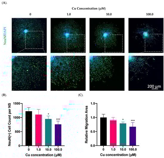 Using the in vitro SVZ-derived neurosphere model, we investigated the impact of Cu treatment on neurosphere migration as well as their differentiation into NeuN(+) neurons. Data presented in Figure 2A showed a Cu dose-dependent suppression of NPSC differentiation; the presence of Cu in the culture medium at 10.0 and 100.0 µM significantly reduced the NeuN(+) cells by 22% (p < 0.05) and 38% (p < 0.001), respectively, compared to controls (Figure 2B). The similar Cu impact was also observed in the migration area, where Cu at 10.0 and 100.0 µM reduced the migration area by 21% (p < 0.05) and 33% (p < 0.001), respectively (Figure 2C). In addition, we observed that the NeuN signal, which is supposedly localized in nucleus [], translocated to the peri-nuclear area, especially when the neurospheres were treated with high Cu concentrations (Figure 2A). Thus, these observations established that Cu dose-dependently suppressed the SVZ adult neurogenesis in vitro.