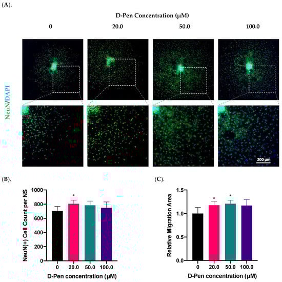 Treatment with D-Pen alone enhanced neurosphere growth in vitro. (A). D-Pen treatment exhibited dose-specific increases in neurosphere differentiation and migration. Neurospheres were stained with NeuN. Scale bar = 200 μm. (B). NeuN(+) mature neurons per neurosphere were quantified in each D-Pen treatment group. Data represent mean ± SD, n = 6; * p < 0.05 as compared with controls. (C). Migration areas of neurospheres were quantified and normalized to the controls. Data represent mean ± SD, n = 6; * p < 0.05 as compared with controls.