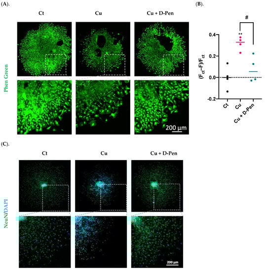 Chemical reagents were purchased from the following sources: copper chloride dihydrate (MW 170.48 g/mol, purity > 99%), D-penicillamine (MW 149.21 g/mol, purity > 98%), 5-bromo-2′-deoxyuridine (Bromodeoxyuridine, BrdU), heparin sodium, and paraformaldehyde (PFA) from Sigma Aldrich (St. Louis, MO, USA); Nunclo Sphera 96-well, U-shaped-bottom microplate, wide bore pipette tips, neurobasal plus medium, B-27 plus supplement, GlutaMAX supplement, gentamicin (50 mg/mL), trypsin-EDTA (0.05%), defined trypsin inhibitor, DNAse I, epidermal growth factor (EGF), fibroblast growth factors (FGF), fetal bovine serum (FBS), Alexa Fluor 488-conjugated goat anti-rabbit IgG (H + L) (A-11008), Alexa Fluor 568-conjugated goat anti-chicken IgY (H + L) (A-11041), Cy5-conjugated goat anti-rat IgG (H + L) (A-10525), Phen Green (cell permeant) from Thermo Scientific (Waltham, MA, USA); Apoptosis assay kit from Abcam (Cambridge, MA, USA); normal goat serum (NGS) from Jackson ImmunoResearch (West Grove, PA, USA); 24 Well Plate with #1.5 glass-like polymer coverslip bottom from Cellvis (Mountain View, CA, USA); Cultrex ready-to-use poly-L-ornithine solution from R&D Systems (Minneapolis, MN, USA); and Triton X-100 from Bio-Rad (Hercules, CA, USA). All reagents were of analytical grade, HPLC grade, or the best available pharmaceutical grade.